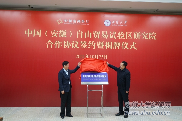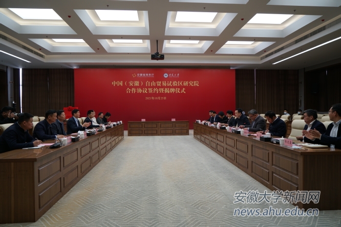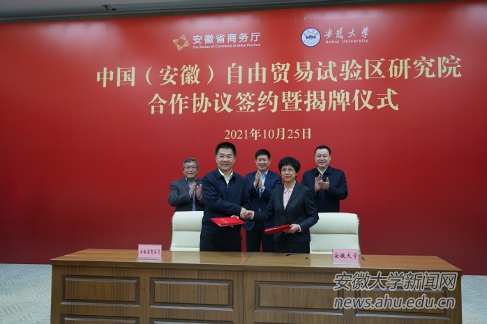 本网讯(融媒体中心 范华飞)10月25日上午,安徽省商务厅 安徽大学共建中国(安徽)自由贸易试验区研究院合作协议签约暨揭牌仪式在磬苑校区协同创新大楼南楼会议厅举行。安徽省商务厅党组书记、厅长张箭,安徽省商务厅党组成员、副厅长刘光,校党委书记蔡敬民,校党委副书记、常务副校长陈诗一,校党委常委、副校长程雁雷出席会议。会议由陈诗一主持。