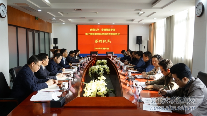 本网讯(发展规划处)10月27日下午,学校与合肥师范学院电子信息类学科建设合作框架协议签约仪式在磬苑校区办公楼B202会议室举行。校长匡光力,校党委常委、副校长薛照明,合肥师范学院校长方东玲,副校长曹卓良出席会议。会议由薛照明主持。