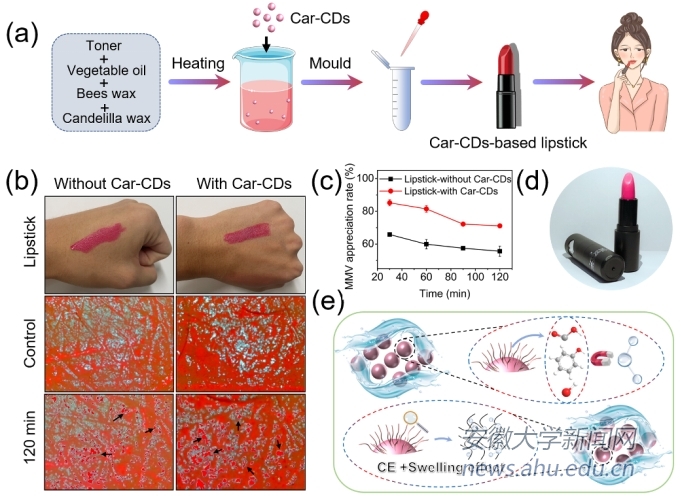 在此基础上,研究团队近期又合成一种具有高效保湿活性的碳点,并首次发现和研究其保湿活性,探索其保湿性能与结构之间的关系。值得注意的是,细胞及溶血实验证实该碳点具有良好的生物相容性,而且体外保湿活性检测结果表明该碳点的吸水/保水效果可与甘油相媲美。将该保湿碳点制作成一款新型、安全的纳米添加剂,便可以制备出一种碳点基保湿润唇膏。经过人体表层皮肤测试(图2),结果表明该碳点在护肤品和化妆品制作领域中具有巨大应用潜力。