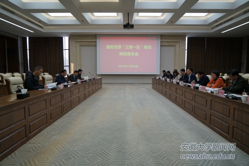 本网讯(融媒体中心 范华飞)11月16日下午,学校在磬苑校区协同创新大楼一楼会议室召开服务支撑“三地一区”建设调研座谈会。安徽省政府办公厅秘书四室主任章平、办公厅秘书四室一级主任科员王文武,安徽省教育厅高教处处长张尔桂、高教处副处长朱永国参加调研座谈会。座谈会由校长匡光力主持。
