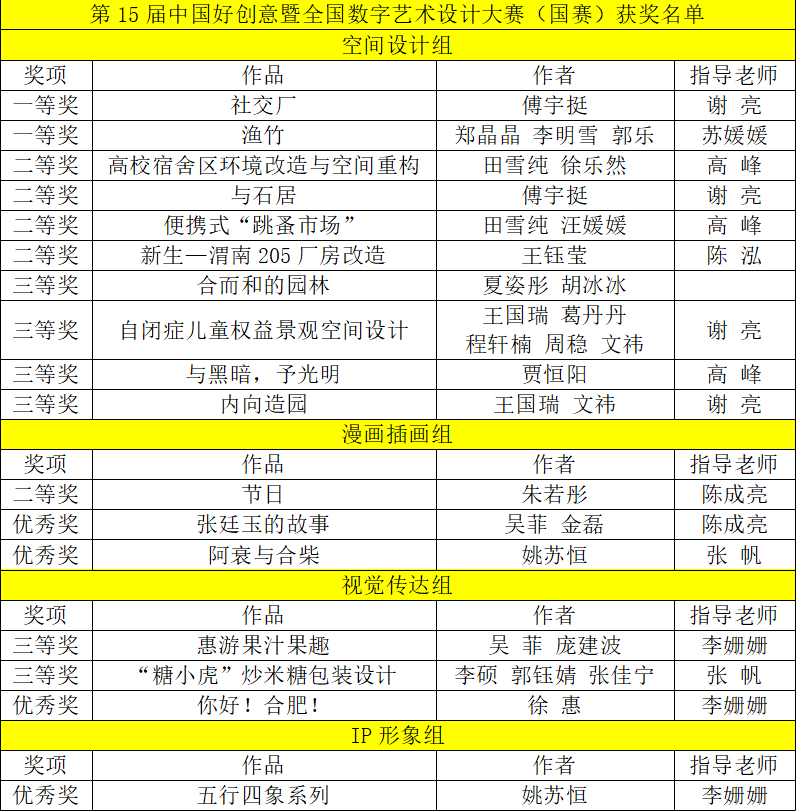 本网讯(艺术学院)近日,第15届中国好创意暨全国数字艺术设计大赛评审结果揭晓,我校艺术学院师生在本次大赛共获奖99项。其中,国赛获得一等奖2项,二等奖5项,三等奖6项,优秀奖4项;省赛获得一等奖16项,二等奖18项,三等奖20项,优秀奖28项。获奖作品涵盖了空间设计组、漫画插画组、视觉传达组、产品造型组、数字动画组和IP形象组等六个组别。