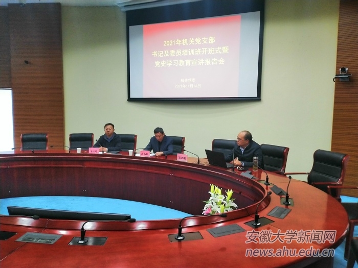 本网讯(机关党委 孙鸣夏)为深入学习贯彻落实党的十九届六中全会精神,进一步提升机关党支部书记及委员的思想政治素质和履职能力,11月16日下午,学校在磬苑校区办公楼B204会议室举办机关党委党支部书记及委员培训班开班式暨党史学习教育宣讲报告会。校党委副书记胡小松出席开班式并作动员讲话,党史学习教育学校党委宣讲团成员、网络思想政治工作中心副主任潘金刚作宣讲报告,会议由机关党委书记朱玉峰主持。