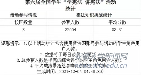 11月29日-12月5日我校通过线上教育的方式,在教育部全国青少年普法网上开展“学宪法 讲宪法”网上学习并完成我校大学生“宪法卫士”2021年行动计划。学校充分利用本次活动契机,加强组织部署,鼓励广大学生积极参加,着力提升学习与考试参与率,力争使学习教育广覆盖、见实效。