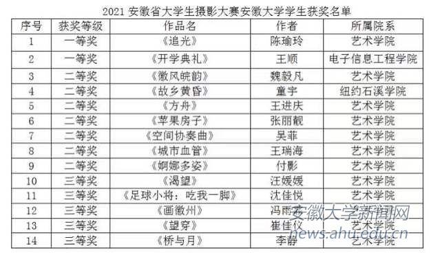 本网讯(艺术学院)日前,由安徽省教育厅主办,安徽师范大学承办,安徽省摄影家协会、安徽画报社协办的2021年安徽省大学生摄影作品大赛公布,我校学生共斩获一等奖2件,二等奖7件,三等奖5件,学校荣获优秀组织奖。