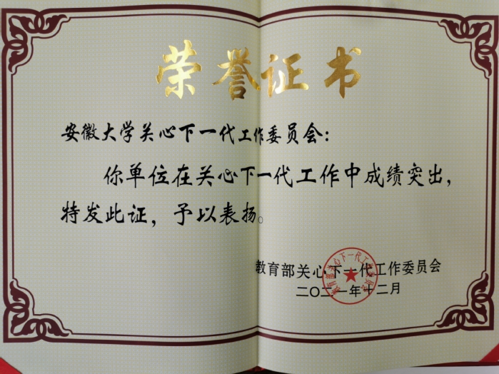 校关工委在校党委的坚强领导下,认真学习贯彻习近平新时代中国特色社会主义思想和习近平总书记关于做好关心下一代工作的重要指示精神,深入贯彻落实教育部和安徽省教育系统关工委的工作要求,建设三个平台(五老学习平台、五老宣讲平台、五老榜样平台),形成三个阵地(质量保障阵地、理论宣讲阵地、实践教育阵地),打造具有安大特色的“关工课堂”品牌,赢得了青年师生的广泛好评,也得到了社会各界的高度认可。此次获奖是对我校关工工作的充分肯定。