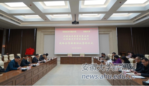 安徽省乡村振兴局社会扶贫处、产业指导处、规划项目处、政策法规处,我校学校办公室、发展规划处、人文社会科学处、继续教育学院、创新发展战略研究院相关负责同志参加了签约仪式。