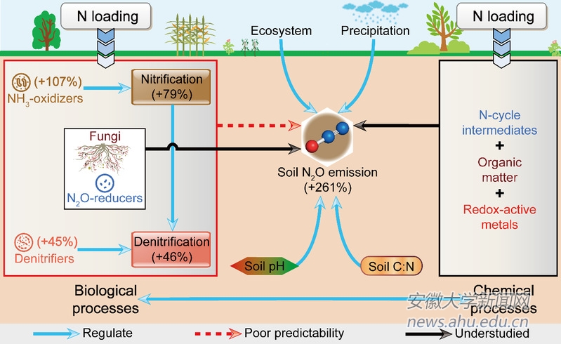 我校团队联合丹麦奥尔胡斯大学等10家欧美研究机构研究了全球尺度土壤N2O排放的潜在机制,发现氮添加背景下N2O排放与其功能微生物多度的改变并不存在显著的相关性,这一发现挑战了基于实验的功能微生物解释土壤N2O排放的传统观点。在进一步的研究中发现,降雨量、土壤酸碱度、土壤碳氮比和生态系统属性等环境因子对土壤N2O排放的改变具有显著的解释力。这些结果明确了非生物因素在土壤微生物氮循环过程中的重要作用,预测土壤N2O排放不能单纯地考虑功能微生物,需要构建多维度模型,协同生态与进化过程分析土壤微生物群落动态。