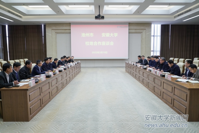 本网讯(融媒体中心 周仲寅 蔡丽丽)3月10日上午,我校与池州市校地合作座谈会在磬苑校区协同创新大楼南楼一楼会议室召开。池州市委书记方正,池州市人大常委会副主任程国清,池州市政府副市长何刚,校党委书记蔡敬民,校党委副书记、常务副校长陈诗一,副校长钱家盛出席座谈会。会议由陈诗一主持。