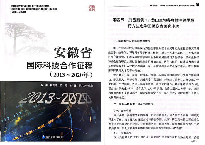 本网讯(资源与环境工程学院 孙丙华)近日,《安徽省国际科技合作征程(2013-2020)》一书面世。该书由省科技厅编辑出版,全面梳理了2013-2020年安徽省与“一带一路”沿线国家科技创新合作状况与宝贵经验,我校“黄山生物多样性与短尾猴行为生态学国际联合研究中心”作为典型案例入选。