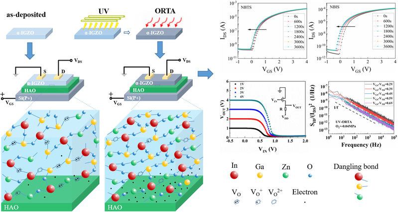 图. 紫外照射与氧氛围低温超快退火协同处理模式及α-IGZO-HfAlO-TFT特性测试图