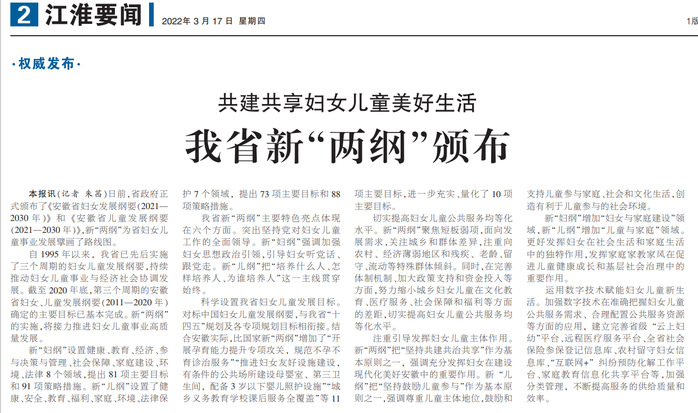 本网讯(社会与政治学院 李庆)3月17日,安徽大学社会与政治学院、安徽大学社会治理研究中心吴宗友教授领衔编制的《安徽省妇女发展纲要(2021—2030年)》和《安徽省儿童发展纲要(2021—2030年)》,由安徽省人民政府正式发布。新“两纲”擘画了新时代安徽省妇女儿童事业发展的美好前景。