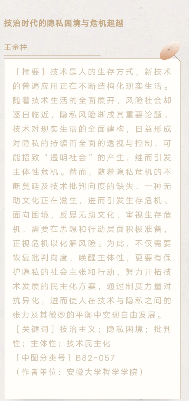 文章指出,技术是人的生存方式,新技术的普遍应用正在不断结构化现实生活。随着技术生活的全面展开,风险社会却逐日临近,隐私风险渐成其重要论题。技术对现实生活的全面建构,日益形成对隐私的持续而全面的透视与控制,可能招致“透明社会”的产生,继而引发主体性危机。