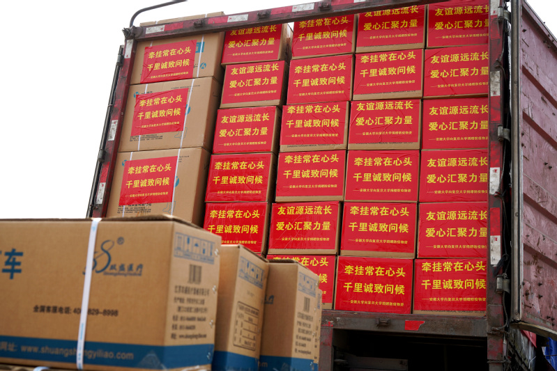 本网讯(融媒体中心 郑敏)4月19日下午,在学校磬苑校区西门,一辆悬挂着“守望相助 休戚与共”“同心抗疫 风雨偕行”标语的专用大货车整装待发。校党委书记蔡敬民,校党委副书记、常务副校长陈诗一,校党委常委、纪委书记、监察专员王忠,校党委常委、副校长周飞及相关部门负责人为学校驰援复旦大学货运专车送行。
