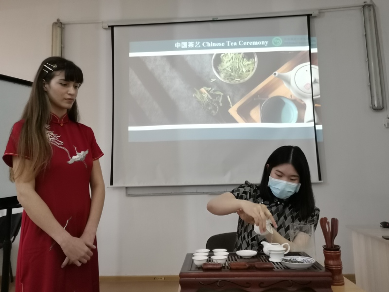 活动由孔子学院教师尹斯琦和学员娜丽雅·马娜福娃(Naila Manafova)共同表演的茶艺拉开序幕。曲声悠扬、茶音飘香,茶艺表演立刻吸引住了所有人的目光。之后,教师王颖和鲍雪英介绍了“国际中文日”和“联合国中文日”的由来和意义,并组织开展了“识字”、“绕口令”、“夹花生”、“传声筒”的等游戏竞赛环节。学生热情高涨,争先恐后地参与,在一片欢乐中感受中国语言和文化的魅力。此外,还应学生要求,在活动现场介绍了中文相关奖学金种类和申请条件。