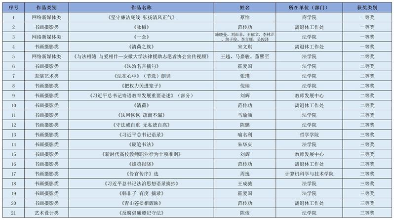 安徽大学廉洁文化、法治文化获奖作品汇总表