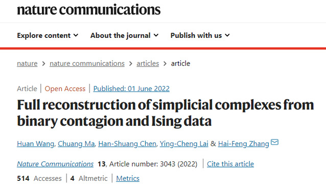 本网讯(数学科学学院)近日,我校数学科学学院张海峰教授课题组与美国亚利桑那州立大学来颖诚教授合作,针对网络科学中的反问题——高阶网络的重构问题,提出了一种纯数据驱动的重构方法。相关研究成果以“Full reconstruction of simplicial complexes from binary contagion and Ising data”为题发表在《Nature Communications》上。安徽大学为唯一通讯单位,安徽大学数学科学学院2020级博士研究生王欢和互联网学院马闯老师为共同第一作者,张海峰教授为论文的通讯作者,物理与光电工程学院陈含爽教授和美国亚利桑那州立大学来颖诚教授为论文的合作者。
