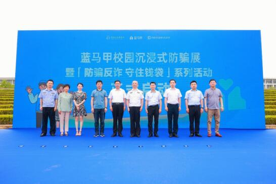 本网讯(保卫处 方林森)6月10日上午,全国首个蓝马甲校园防骗体验展暨合肥“防骗反诈 守护钱袋”系列活动启动仪式在我校磬苑校区举行,校党委常委、副校长周飞出席并致辞,省公安厅二级警务专员刘保,省委宣传部、省教育厅、共青团安徽省委、省通信管理局、人行合肥中心支行、省公安厅刑警总队、合肥市以及我校有关部门负责同志出席活动。