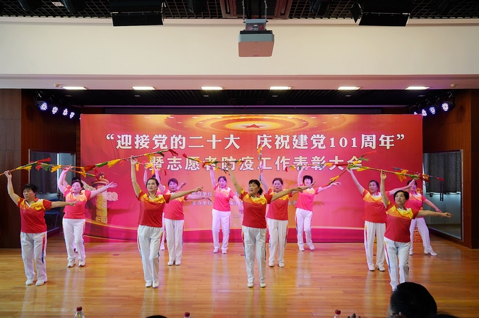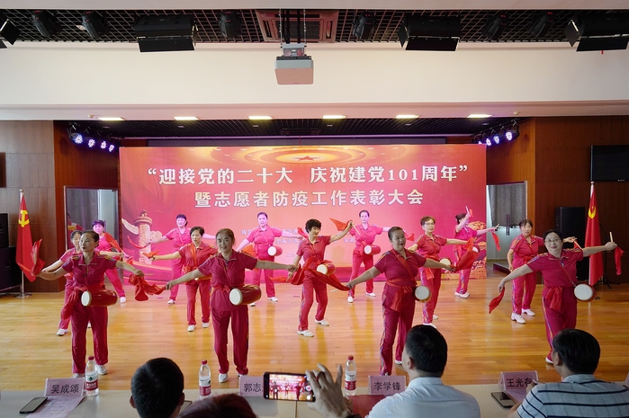 大会在龙河校区工会多功能厅举行,辖区小区支部党员、非公企业党员、各单位防疫志愿者参加。会上,安徽大学女知联艺术团、辖区居民代表表演了安塞腰鼓—祖国颂、打花棒、剪纸等节目。
