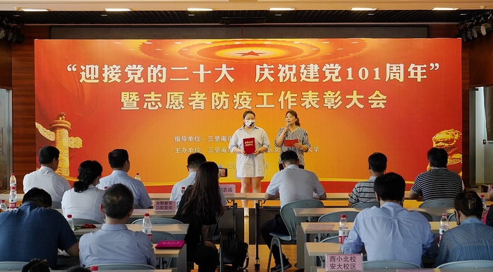 本网讯(融媒体中心 吕昊)6月27日下午,三里庵街道文明办、三里庵街道龙河路社区与我校联合举办“迎接党的二十大 庆祝建党101周年”志愿者防疫工作表彰大会。举办本次大会是为了进一步弘扬志愿服务精神,凝聚爱心力量,表彰先进,树立典型,激励更多的党员群众参与到志愿队伍中来,更好发挥党员先锋模范作用和基层党组织战斗堡垒作用。