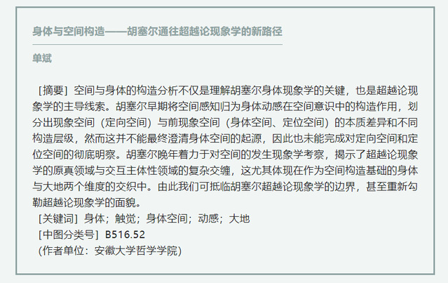 本网讯(哲学学院 李贤)近日,2022年第7期《哲学研究》杂志发表了哲学学院单斌副教授的文章《身体与空间构造——胡塞尔通往超越论现象学的新路径》。