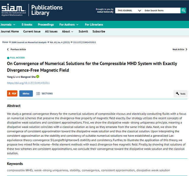 本网讯(数学科学学院)近日,数学科学学院青年教师李扬与合作者在可压缩磁流体力学方程组数值解的收敛性研究中取得新进展,相关成果发表于计算数学领域国际顶尖学术期刊SIAM Journal on Numerical Analysis,安徽大学为第一单位。
