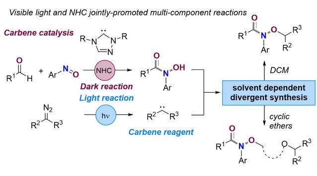 异羟肟酸酯是一类具有重要应用价值的有机化合物,不仅具有抗真菌、抗癌等药理活性,同时该类结构也经常用作合成中间体以及手性配体。由于其具有丰富的应用价值,开发异羟肟酸酯衍生物的合成方法一直备受学术界和工业界的青睐。自从2018年芳基重氮酯被证明能够在单一可见光照射下分解产生游离态卡宾以来,化学工作者们便对重氮化合物的光化学转化产生了极大的兴趣。在过去的几年里,重氮化合物的光化学转化取得了长足的发展。然而其反应组分大多局限于两组分反应,另外将卡宾转移反应与其他类型的催化模式相结合的报道非常有限。