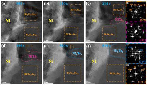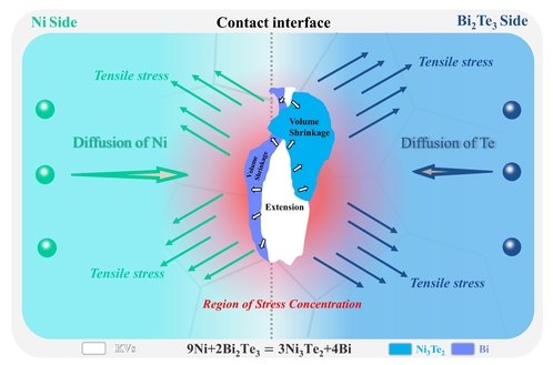 在最新研究中,该团队通过高分辨率的球差矫正透射电镜结合原位热电样品杆,系统研究了Ni/Bi2Te3界面上一系列的结构演变(图2),揭示了Kirkendall孔洞的形成机理,及在形成过程中的多阶段生长机制(图3)。Kirkendall孔洞的形成和生长可以被看作是局部应力的平衡,包括三个方面的贡献:(1)由于Ni和Te/Bi之间相互扩散不均匀而产生的空位凝聚;(2) Ni和Bi2Te3之间界面反应造成体积收缩;(3) Ni和Bi2Te3之间的塑性失配。该工作从微观角度说明了Kirkendall效应对热电器件的危害,对于需协同考虑低界面电阻率、高结合强度和高热稳定性这三重要求的热电器件界面材料(TEiM)的设计提供了一些新的见解和思路。
