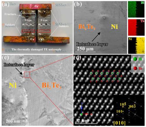 热电器件的稳定性是其得以实际应用的前提,然而在实际应用过程中,部分热电材料与电极之间容易开裂而大大缩短了热电器件的寿命(图1a)。其中Kirkendall孔洞的形成是导致热电材料开裂的一个重要因素,主要原因是热电材料与电极的界面处不均匀的元素扩散。探究Kirkendall孔洞的形成机制,理解裂纹的形成规律,是抑制的裂纹的形成的前提,对于提高热电器件的实际应用有重要意义。
