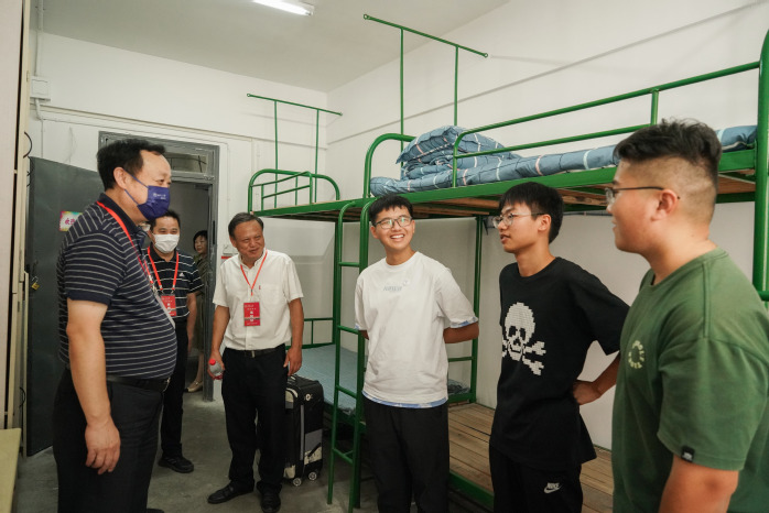 校党委书记蔡敬民(左一)到新生宿舍看望新生