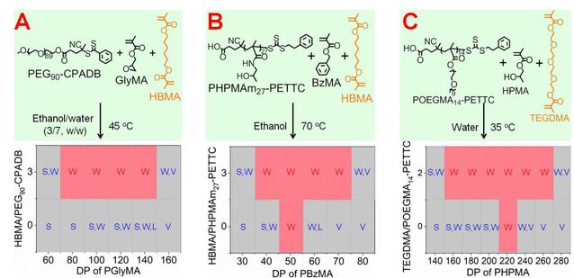 图3. 由不同的单体、RAFT试剂、交联剂和溶剂等组成的原位交联PISA体系的形貌相图。