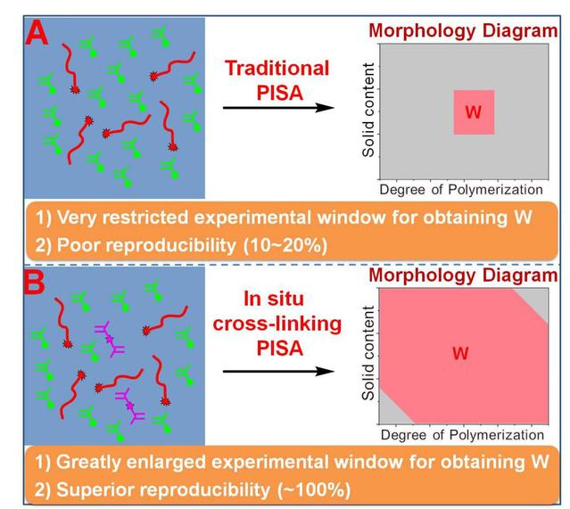 本网讯(物质科学与信息技术研究院)聚合物纳米线(或称蠕虫状胶束)由于其高度各向异性的形貌结构而展示出许多优异的性能和广阔的应用前景,比如作为流变改性剂、超级絮凝剂、高效的Pickering乳化剂以及用于干细胞培养/存储的可灭菌凝胶。然而获得聚合物纳米线的实验室窗口非常窄,从而导致制备聚合物纳米线的难度较大并且重复性非常差。聚合诱导自组装(PISA)是近年来发展起来的一种高效的聚合物自组装方法。基于PISA的形貌相图构建在一定程度上缓解了聚合物纳米线制备难度大和可重复性差的问题,但是这并没有改变“获得聚合物纳米线的实验室窗口非常窄”这一现状。实际上,在制备聚合物纳米线时,即使有预先构建的形貌相图为参考,少量的试错依然在所难免。在实验室的制备当量下(克级甚至毫克级),通过少量的试错来制备聚合物纳米线并不会造成太大的浪费,然而当放大生产时势必会使制备成本急剧攀升。因此如何扩大聚合物纳米线的形貌相区从而提高制备聚合物纳米线的可重复性是制约其进一步应用的一个瓶颈问题。