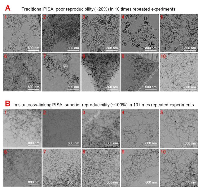 图2. (A) 以传统PISA所得形貌相图为参考进行10次重复实验制备聚合物纳米线所得产物的TEM照片,(B)以原位交联聚合诱导自组装所得形貌相图为参考进行10次重复实验制备聚合物纳米线所得产物的TEM照片。