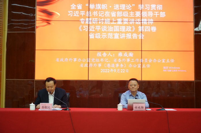 本网讯(融媒体中心 范华飞)9月22日下午,“举旗帜·送理论”学习贯彻习近平总书记在省部级主要领导干部专题研讨班上重要讲话精神、《习近平谈治国理政》第四卷省级示范宣讲报告会在磬苑校区文典阁报告厅举行。省政府外事办公室党组书记、省委外事工作委员会办公室主任、省政府外事(港澳事务)办公室主任雍成瀚作宣讲报告,校党委书记蔡敬民主持报告会。省人民政府外事办公室二级巡视员胡健,校领导陈诗一、周飞、钱家盛、高清维、孙长银、王守国参加报告会。