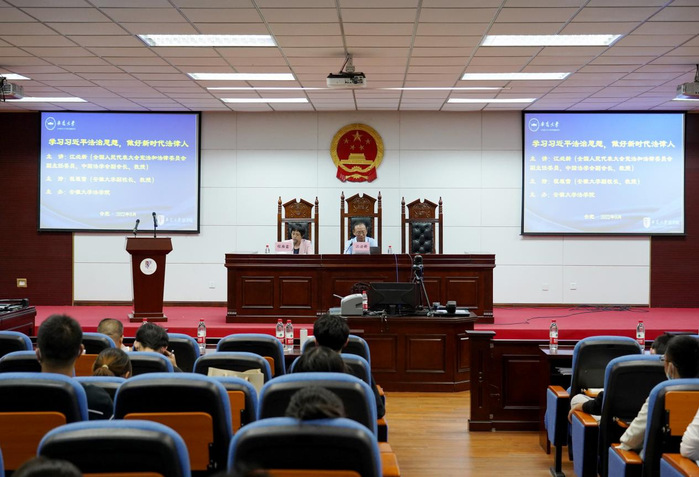 本网讯(融媒体中心 陈佳慧)9月25日晚,全国人大宪法和法律委员会副主任委员、中国法学会副会长江必新教授在法学院学山模拟法庭作题为“学习习近平法治思想,做好新时代法律人”的专题报告。校党委书记蔡敬民会见,校党委常委、副校长程雁雷主持报告会。报告会线上、线下同时进行。