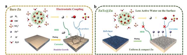图1. (a)Bare Zn在水系锌电发生副反应,(b)ZnTe@Zn在水系锌电充放电过程中阻止副反应的发生。
