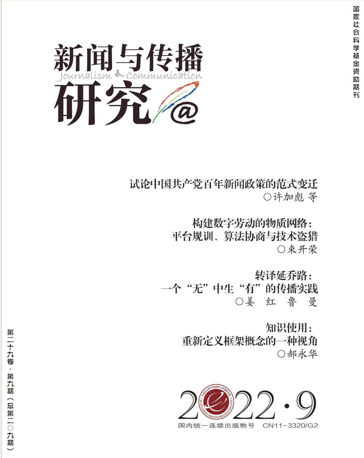 本网讯(新闻传播学院)近日,2022年第9期《新闻与传播研究》杂志发表了新闻传播学院姜红教授、2020级博士生鲁曼的论文《转译延乔路:一个“无”中生“有”的传播实践》。这也是姜红教授在国内学界公认的顶级刊物《新闻与传播研究》上发表的第10篇论文。
