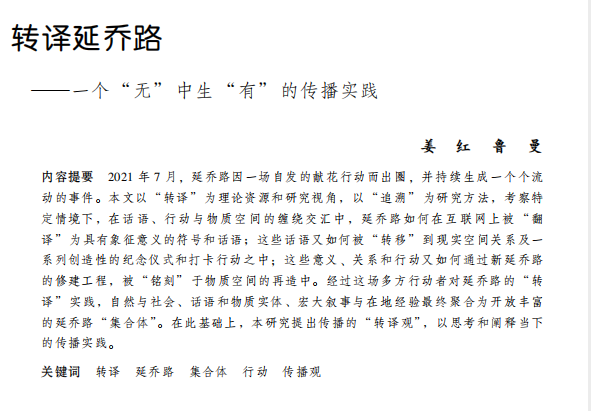 该研究为国家社会科学基金“当代中国新闻传播话语范式的‘实践转向’研究”的重要成果。论文以“转译”为理论资源和研究视角,考察延乔路这一“集合体”,并提出传播的“转译观”,试图在“理论操演”中寻求理论和在地经验的“对穿”,重新建构当代中国新闻传播的话语体系和方法论。