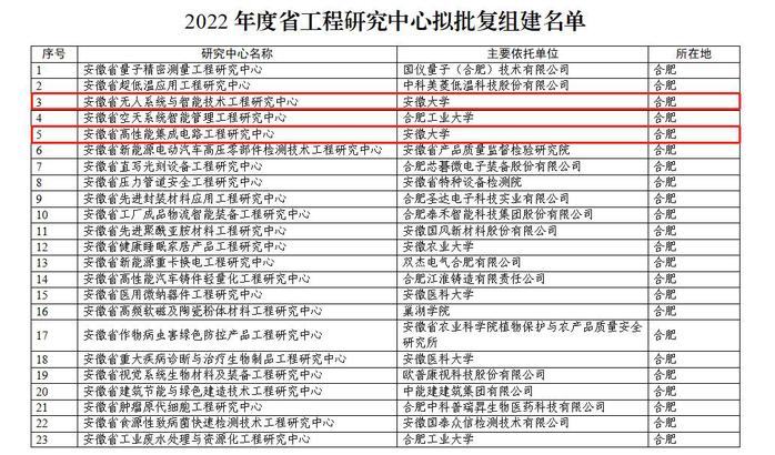 本网讯(融媒体中心)近日,安徽省发展和改革委员会发布了《安徽省发展改革委关于公布2022年度工程研究中心批复、认定结果的通知》,我校申报的安徽省无人系统与智能技术工程研究中心、安徽省高性能集成电路工程研究中心获批立项建设,另外其安徽省石墨烯先进材料工程实验室拟认定为2022年度省工程研究中心。此前,我校申报的自主无人系统技术教育部工程研究中心正式获批立项。
