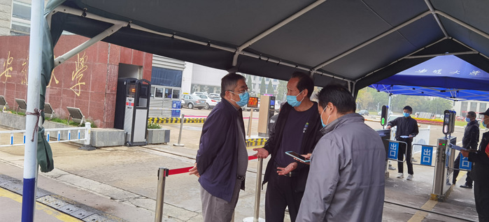 督查组认真检查了门岗的值班值守情况,查阅比对了教职工进校登记和各单位的申报表,听取了有关单位负责人的介绍,向辛勤值守在疫情防控一线的工作人员表示诚挚的问候。在两个校区食堂,督查组仔细了解伙食供应、就餐师生的反映以及物资储备情况。