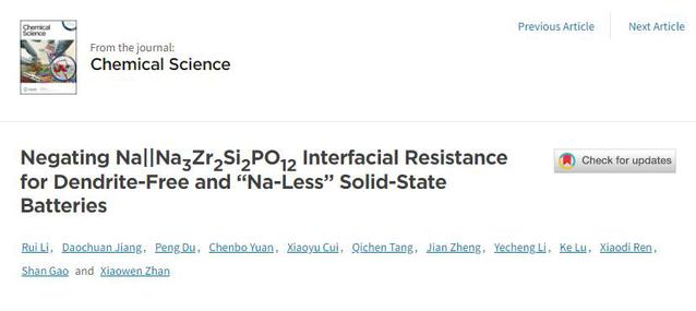 相关成果以“Negating Na||Na3Zr2Si2PO12 Interfacial Resistance for Dendrite-Free and “Na-Less” Solid-State Batteries”为题发表在英国皇家化学学会旗舰期刊、自然指数期刊《Chemical Science》上,安徽大学硕士研究生李瑞和材料科学与工程学院江道传老师为本文共同第一作者,詹孝文、高山、鹿可教授为通讯作者。