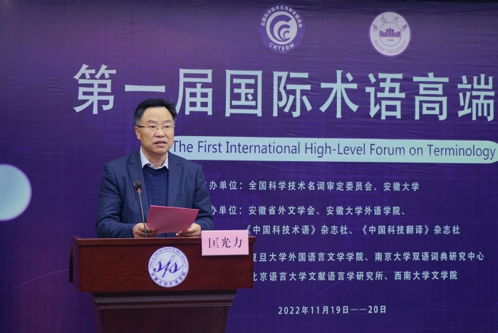 匡光力代表安徽大学,向参加论坛的专家学者表示热烈欢迎,向长期以来关心支持我校建设发展的领导同仁表示感谢。匡光力介绍了我校“双一流”建设发展情况以及外语学院近年来办学成绩。匡光力说,举办首届国际术语高端论坛,加强中国特色社会主义术语学研究,是学习宣传贯彻党的二十大精神的切实举措,对于提升我国国际话语权具有重要意义。作为“多语种术语学理论与应用研究基地” 的共建单位,我校将在全国科学技术名词审定委员会的指导下,整合学科力量,加强创新攻关,努力把基地建设好、发展好,推动构建中国特色学术话语体系,服务提升国际传播效能,更好展现中国形象。