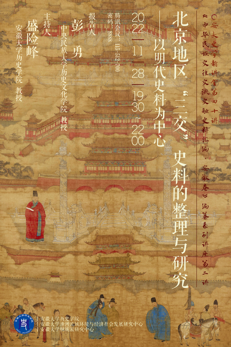 【报告人简介】彭勇,中央民族大学历史文化学院教授,博士生导师,兼任中国明史学会副会长、中国民族史学会副会长,北京市教学名师,入选国家级人才计划,曾获北京市教学成果一等奖、北京市科研成果二等奖和国家古籍整理一等奖等。主要从事明清史教学和研究,代表作有《明代班军制度研究》《明代北边防御体制研究》《明史》《四镇三关志校注》等。目前在主持国家社科基金项目、北京市社科重大项目《北京地区各民族交往交流交融史料的整理与研究》等。