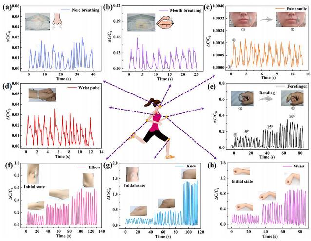 研究表明,在压力传感器工作过程中,电极的微米叶拓扑结构有利于电解质中离子的抽取和迁移,制得的传感器用于柔性电子皮肤时,具有宽检测范围,低检测限和优异的耐久性。器件在50~150 Pa的范围内,灵敏度为1.60 kPa-1,在150 Pa-8.5 kPa范围内,灵敏度为1.01 kPa-1,检测下限达0.59 Pa,最大检测范围~220 kPa,经过10000次循环,相对电容能保持97.92%,应用于人体关节运动、面部表情的监测与识别,为离子型传感器件与装置的设计与实现提供了新思路。