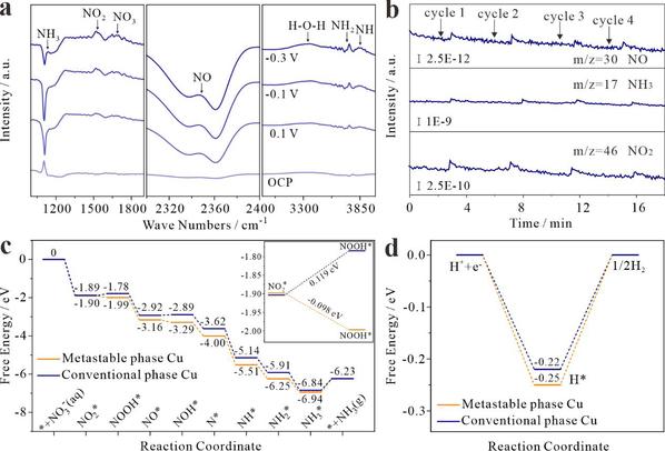遇鑫遥研究团队通过氧气等离子体氧化和后续电还原的方式成功制备了亚稳相铜电催化剂(图1)。由于等离子体的反应特性,氧化后获得的样品呈现有趣的三明治结构(Cu/Cu2O/CuO)。研究发现,MP-Cu比CP-Cu具有更长的铜-铜键(0.261 nm),得益于优化的电子态密度,MP-Cu相比于CP-Cu展现出更为优异的合成氨性能,选择性、法拉第效率和产率分别高达97.8%、99.8%和0.543 mmol h-1 cm-2。研究团队通过原位傅里叶变换红外光谱和差分电化学质谱推测了合成氨的反应路径,并利用密度泛函理论计算证明亚稳相铜能够有效吸附活性氢原子,降低反应自由能,促进亚硝酸根的氢化反应,进而提升合成氨的选择性和法拉第效率(图2)。此外,研究团队还将亚稳相铜电催化剂应用于锌-硝酸根电池体系,实现了既能发电又能产氨的一石二鸟作用。这项工作为高性能非常规相电催化剂的合理设计和合成提供了一个有吸引力的策略。
