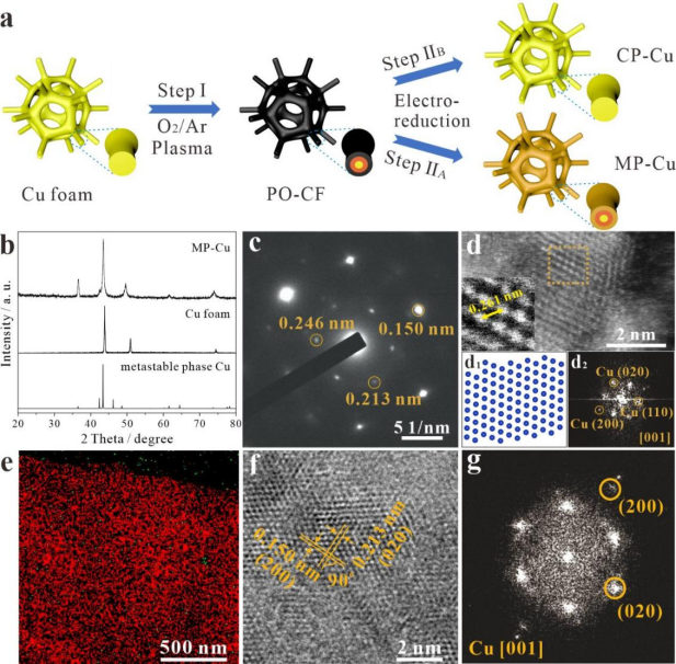 图1 亚稳相铜和常规稳定相铜合成示意图及亚稳相铜的表征