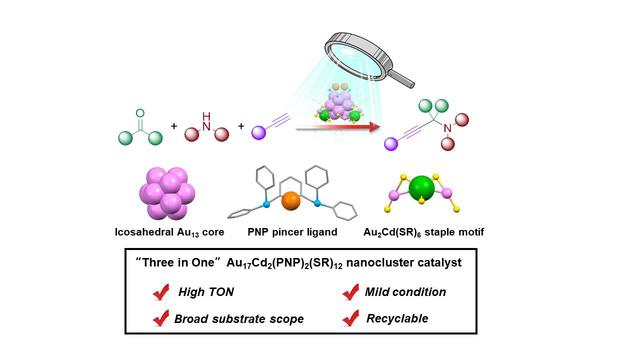 该工作将异金属原子(镉)和功能化有机配体(含有碱性氮位点的双齿膦配体)引入金纳米团簇,获得了一类具有两个金属(Cd)位点、两个有机(N)位点的金属纳米团簇催化剂Au17Cd2(PNP)2(SR)12 (PNP = 2,6-bis(diphenylphosphinomethyl)pyridine, SR = 4-MeOPhS)。该催化剂由一个正二十面体几何构型的Au13核,两个Au2Cd(SR)6模块以及两个膦-氮-膦pincer配体组成。相比于常用的一价铜催化剂,该团簇表现出更高的催化效率,其转化数(TON)高达9200。反应结束后,通过向体系中加入团簇不良溶剂(如甲醇、乙腈),团簇很快从体系中沉降出来,通过离心和简单的清洗,催化剂能保持结构和催化活性进行循环利用。通过与结构类似、只有单一金属(或有机)位点的金纳米团簇催化性能的对比,结合原位谱图技术,作者提出了Au13核与Au2Cd(SR)6、膦-氮-膦pincer配体协同活化的催化模式。该工作为构筑高效的金属纳米团簇催化剂,以及开发高效的有机串联反应提供了新的策略。