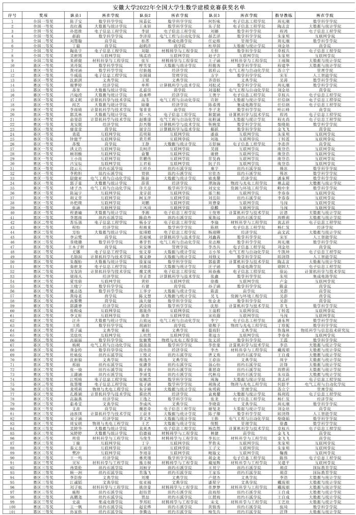 本网讯(数学科学学院 周礼刚)近日,2022年全国大学生数学建模竞赛成绩公布,我校学子发挥出色,在去年国际大学生数学建模竞赛获得全省高校最好成绩的基础上,再次取得新突破!获得省级以上奖项共计101项,包括全国一等奖4项、全国二等奖5项;安徽赛区一等奖32项、赛区二等奖32项、赛区三等奖28项。全国一等奖获奖数量位居全国并列第二,为安徽省高校中最好成绩,此成绩创我校在该学科竞赛的历史新高。此外,学校共计27位老师获2022年全国大学生数学建模竞赛“优秀指导老师”荣誉称号。