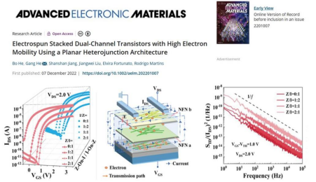 相关成果以《Electrospun Stacked Dual-Channel Transistors with High Electron Mobility Using a Planar Heterojunction Architecture》为题发表在微电子领域国际知名期刊《Advanced Electronic Materials》上,安徽大学材料科学与工程硕士生何波为第一作者,何刚教授为通讯作者。