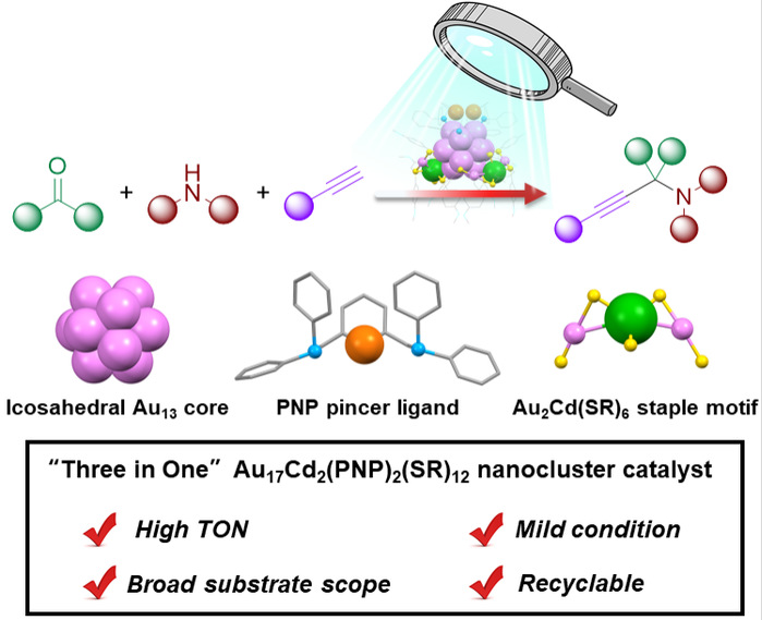 该工作将异金属原子(镉)和功能化有机配体(含有碱性氮位点的双齿膦配体)引入金纳米团簇,获得了一类具有两个金属(Cd)位点、两个有机(N)位点的金属纳米团簇催化剂Au17Cd2(PNP)2(SR)12 (PNP = 2,6-bis(diphenylphosphinomethyl)pyridine, SR = 4-MeOPhS)。该催化剂由一个正二十面体几何构型的Au13核,两个Au2Cd(SR)6模块以及两个膦-氮-膦pincer配体组成。相比于常用的一价铜催化剂,该团簇表现出更高的催化效率,其转化数(TON)高达9200。反应结束后,通过向体系中加入团簇不良溶剂(如甲醇、乙腈),团簇很快从体系中沉降出来,通过离心和简单的清洗,催化剂能保持结构和催化活性进行循环利用。通过与结构类似、只有单一金属(或有机)位点的金纳米团簇催化性能的对比,结合原位谱图技术,作者提出了Au13核与Au2Cd(SR)6、膦-氮-膦pincer配体协同活化的催化模式。该工作为构筑高效的金属纳米团簇催化剂,以及开发高效的有机串联反应提供了新的策略。