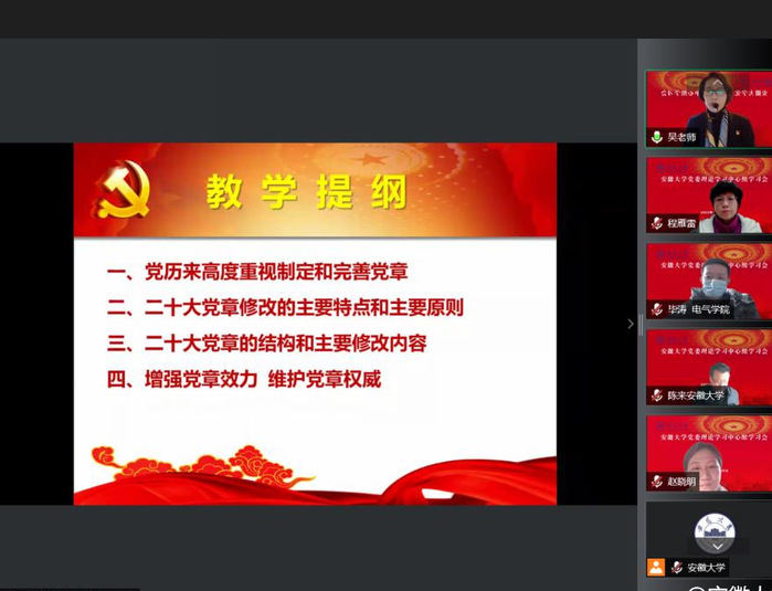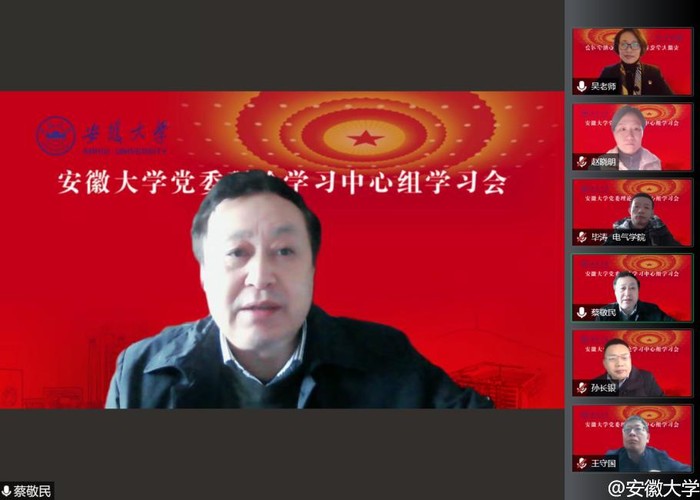 本网讯(融媒体中心)12月28日下午,学校通过线上方式召开校党委理论学习中心组学习会。会议以“学习党章、遵守党章、贯彻党章、维护党章,推动党章各项新部署在学校落地生根”为主题,邀请中共安徽省委党校(安徽行政学院)党的建设教研部主任、教授吴梅芳作《学习二十大党章 维护党章权威》辅导报告。校党委书记蔡敬民主持会议并讲话,校党委理论学习中心组成员参加会议。